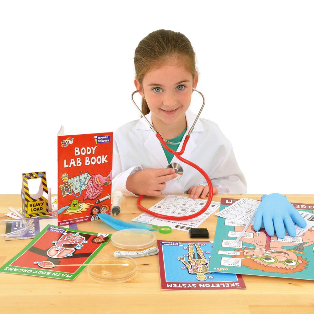 Contents: stethoscope, 2 petri-dishes, gloves, 2 swabs, feather, tape measure, syringe, vegetarian gelatine, tubing, straw, fingerprint ink pad, ID sheets, magnifying glass, 5 wooden sticks, 2 rubber bands, 2 ziplock bags, reusable bone and organ stickers, skeleton card, organ card, printed card pieces, digestive system poster, stickers, notepad and 32-page Lab book.