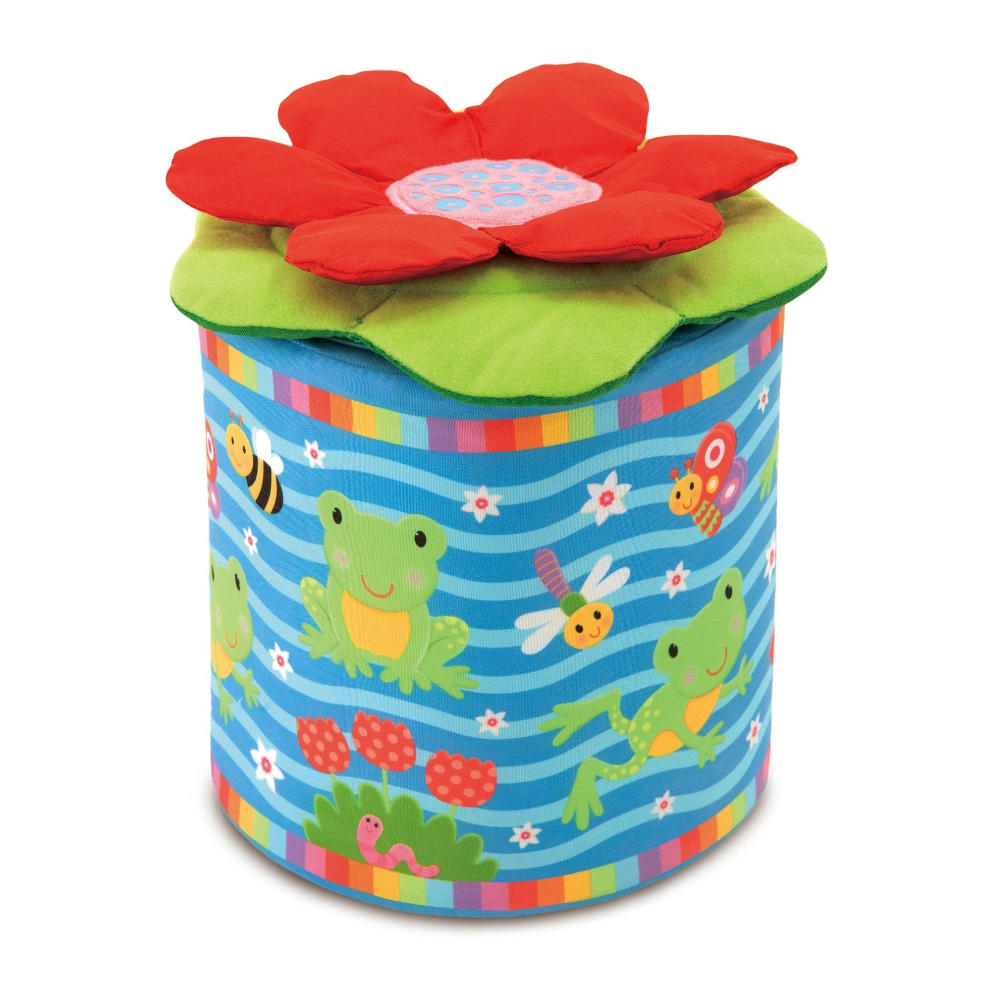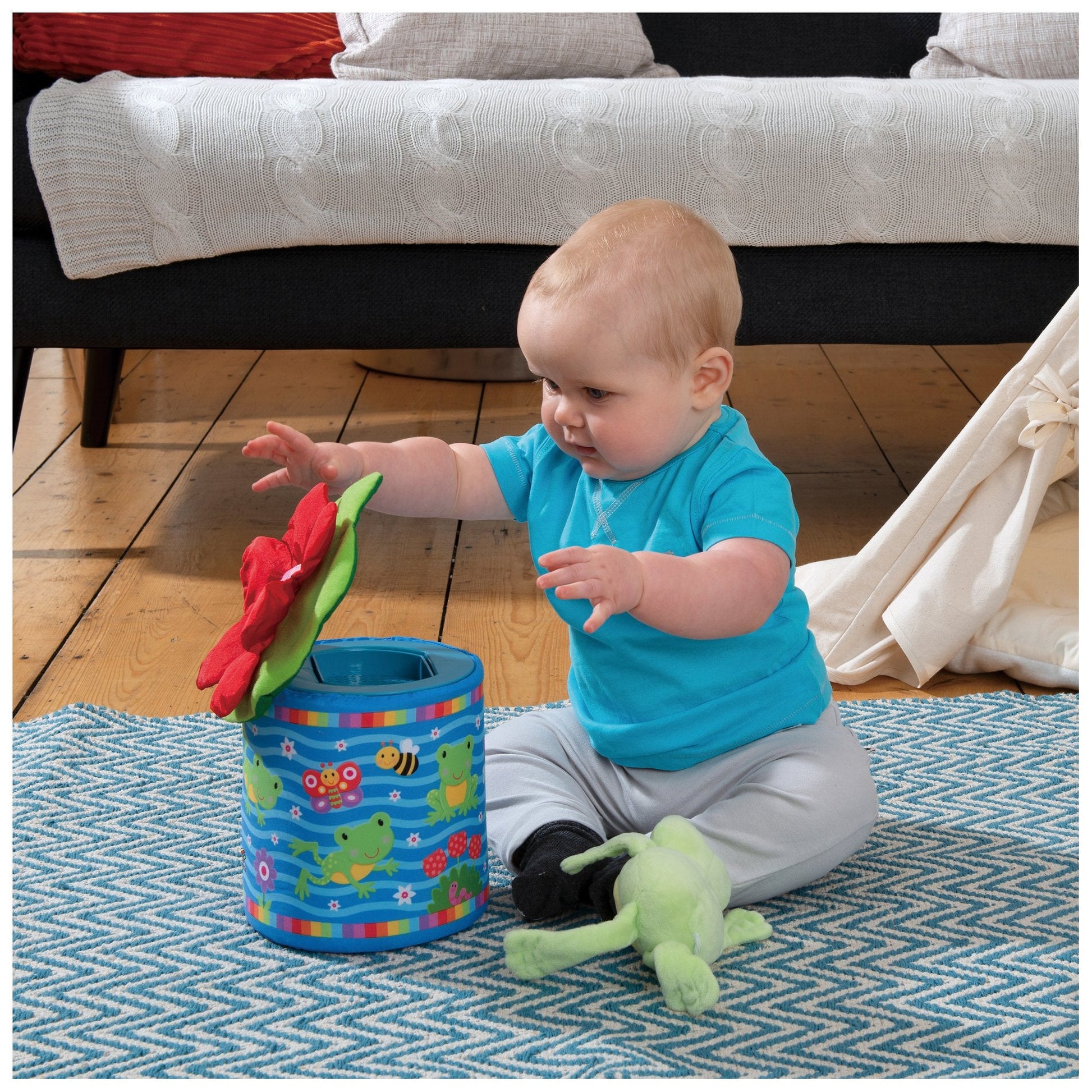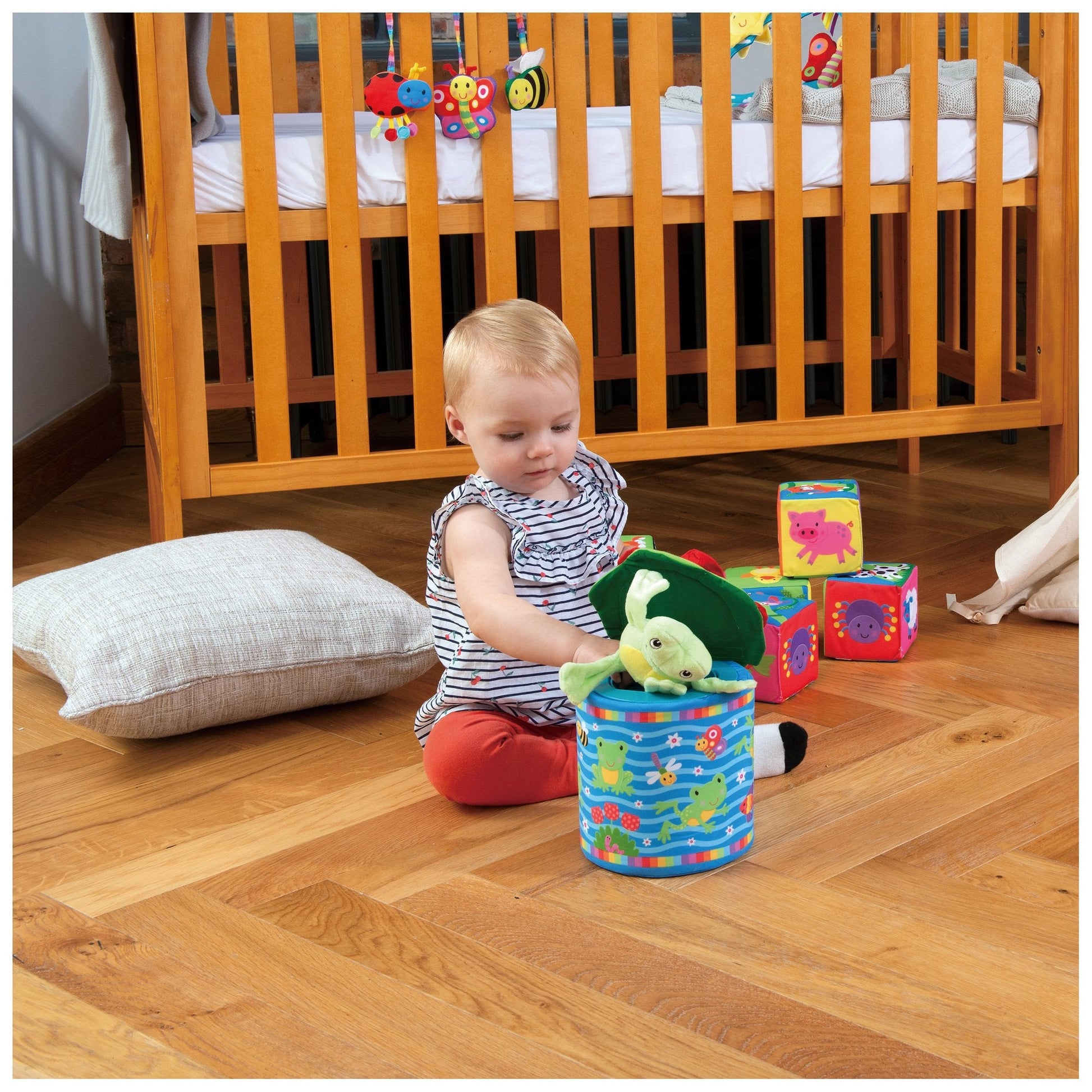 A soft fun version of the classic jack-in-a-box toy, with a difference - lift the lid and the frog jumps right out of the box. The game of peep-o can be repeated time and time again. The frog will squeak and rattle; the lily pad lid has crinkle petals and different textures to explore. Soft and safe with removable, machine washable box and lid covers.