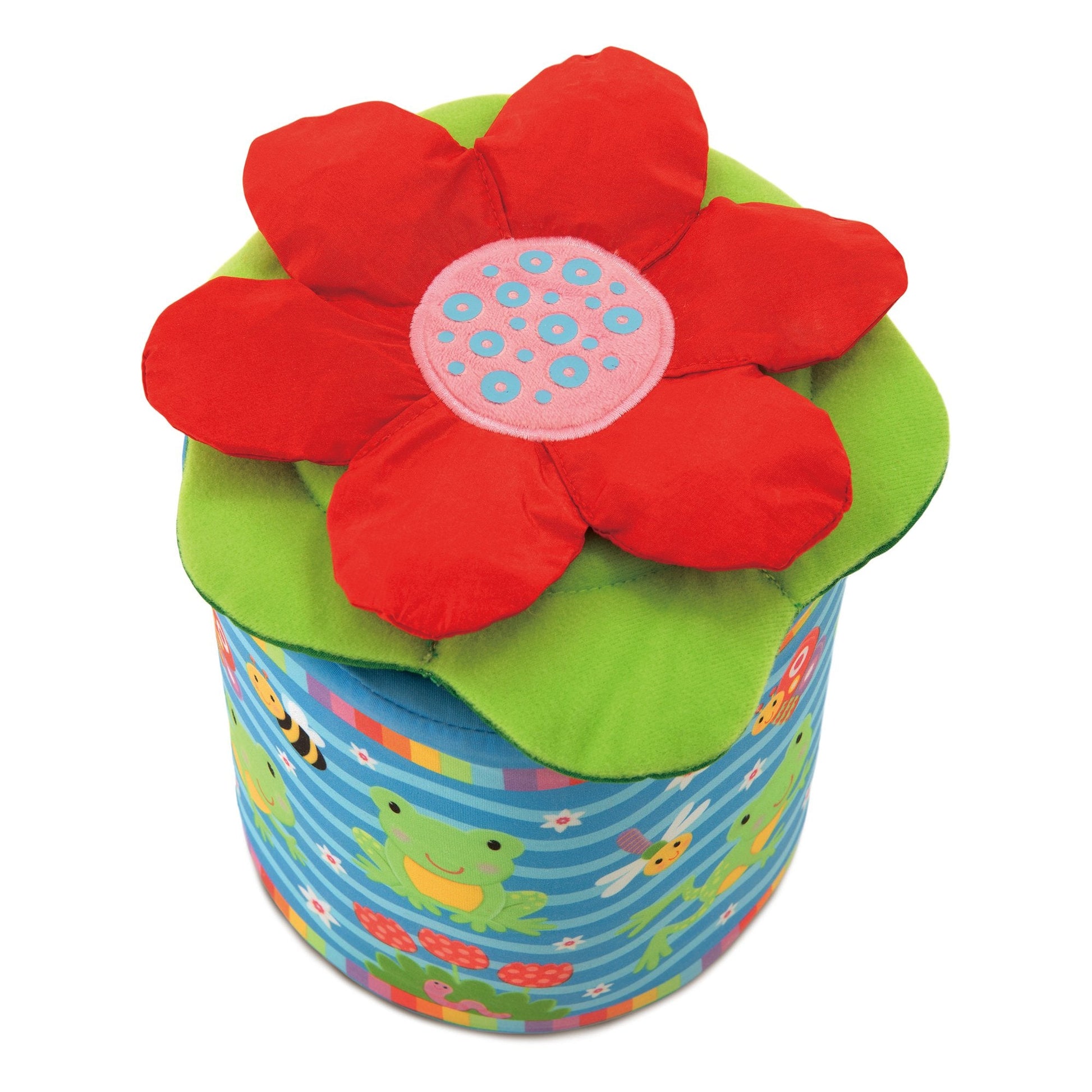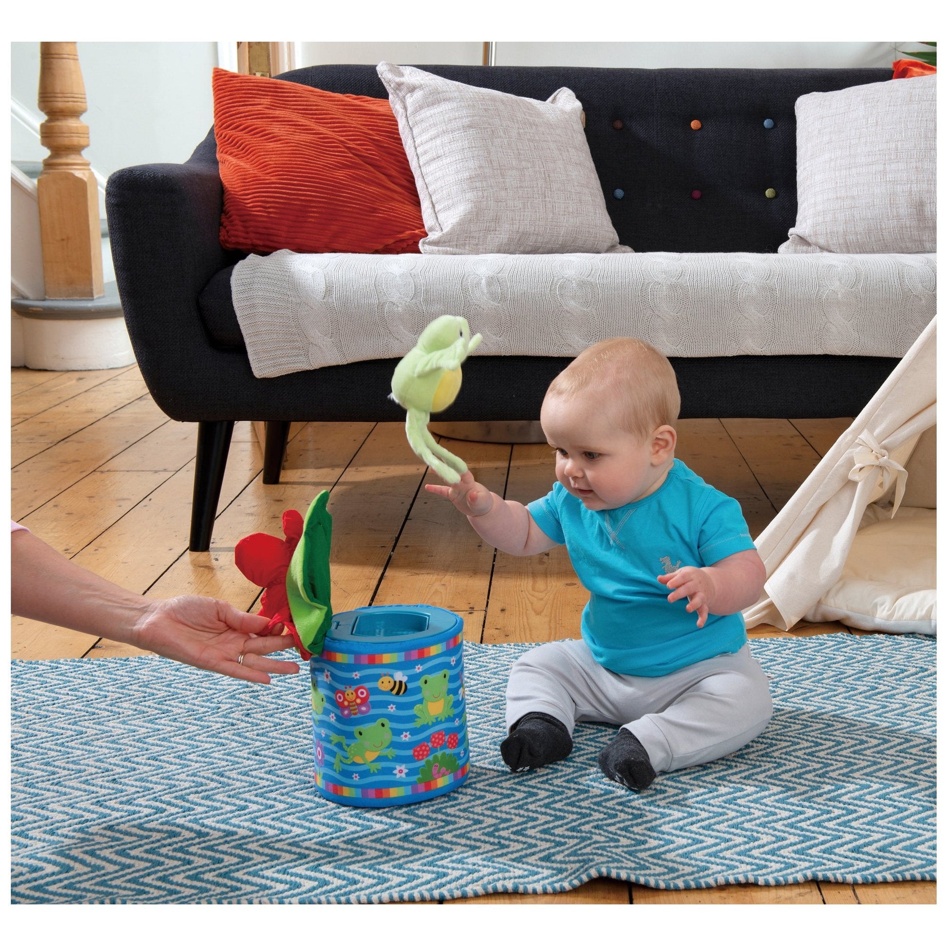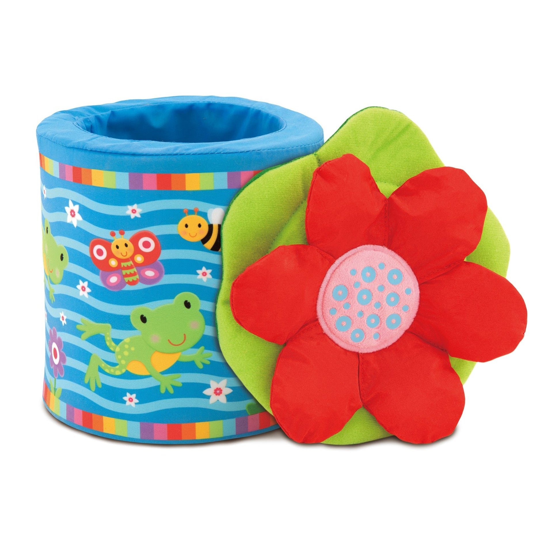 A soft fun version of the classic jack-in-a-box toy, with a difference - lift the lid and the frog jumps right out of the box. The game of peep-o can be repeated time and time again. The frog will squeak and rattle; the lily pad lid has crinkle petals and different textures to explore. Soft and safe with removable, machine washable box and lid covers.