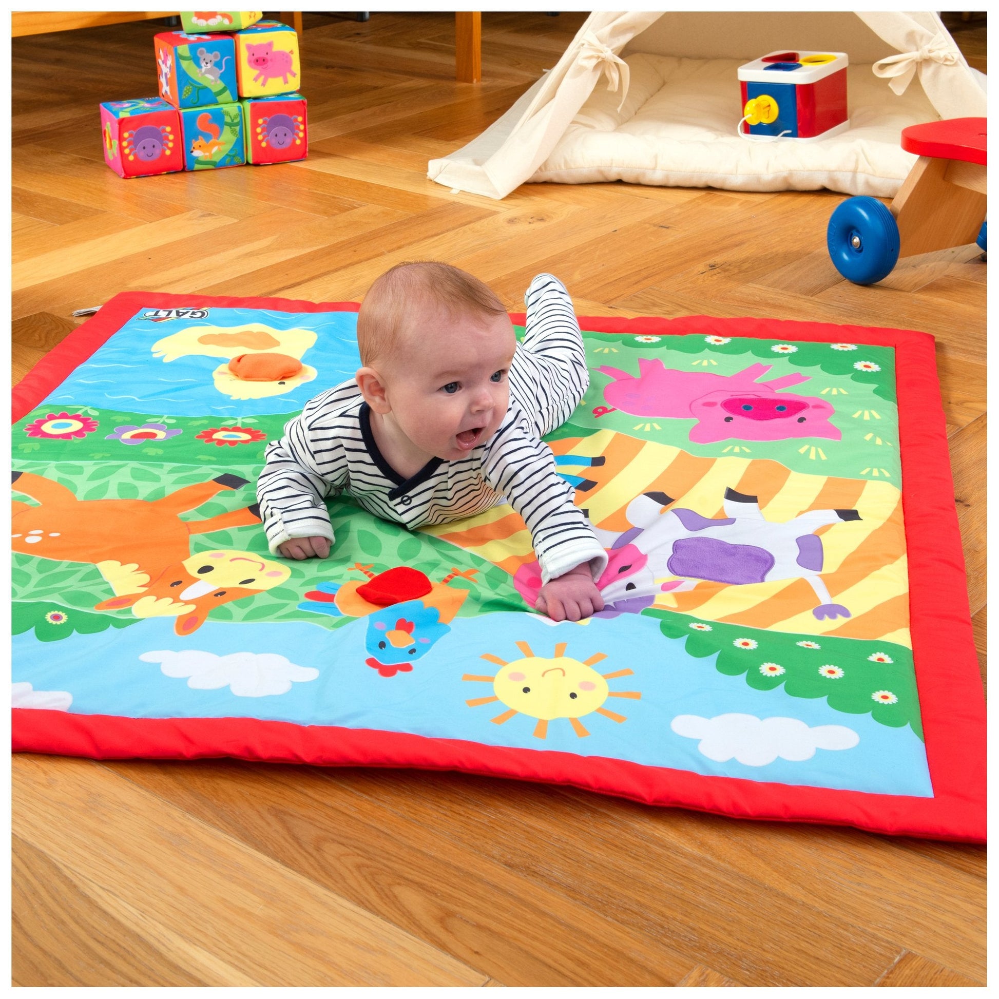 A large multi-sensory playmat with 6 colourful farm friends. Soft and padded for baby's comfort, the perfect place for a young baby to lie down. As baby develops, there are textures and sounds to explore. Features: squeaky beak, velour patch, shiny nose, crinkle wing, woolly head and cord tail. Machine washable.